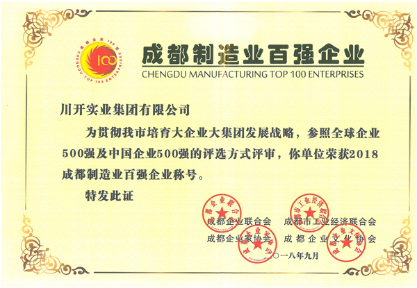11月13日,成都企業(yè)聯(lián)合會、成都市工業(yè)經(jīng)濟聯(lián)合會發(fā)布“2018成都企業(yè)100強”榜單,川開實業(yè)集團有限公司榮獲“2018年成都企業(yè)100強企業(yè)”(排名86位)、“2018年成都制造業(yè)100強”(排名39位)、“2018年成都民營企業(yè)100強”(排名36位)榮譽稱號。