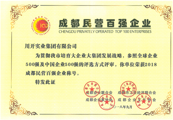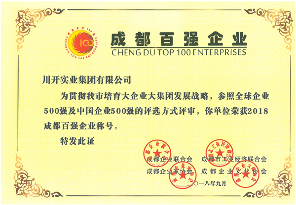 川開實業(yè)集團有限公司榮獲 “2018年成都百強企業(yè)” 榮譽稱號