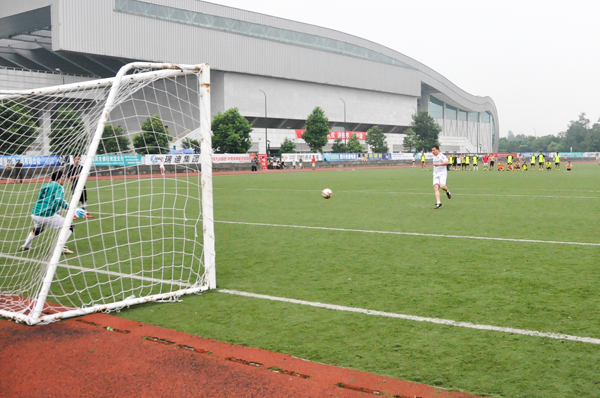 這樣的比分觀眾都以為會(huì)維持到終場(chǎng),蛟龍港的拉拉隊(duì)已經(jīng)開(kāi)始在慶賀了,但球場(chǎng)上的變化比預(yù)想的快得多。第72分鐘,我方16號(hào)瞧準(zhǔn)前場(chǎng)混戰(zhàn)機(jī)會(huì),推射破門,將比分改寫為3比2,快要涼快下來(lái)的草皮又迅速升溫。離比賽結(jié)束還有兩分鐘,蛟龍港40號(hào)球員在后場(chǎng)主動(dòng)倒地犯規(guī)吃了黃牌,還給我方一個(gè)位置絕佳的任意球,當(dāng)他知道他也許無(wú)意識(shí)的動(dòng)作將改變整個(gè)比賽的格局時(shí)一定后悔不已,我方6號(hào)發(fā)球,皮球劃出一道美麗的弧線直接飛進(jìn)對(duì)方球門,3比3平。無(wú)論是場(chǎng)上還是場(chǎng)下,蛟龍港的隊(duì)員被這粒進(jìn)球打懵了;這一粒進(jìn)球讓我們?cè)趫?chǎng)的人全部沸騰了,場(chǎng)上隊(duì)員的頑強(qiáng)和彼此的信任、場(chǎng)下隊(duì)員以及拉拉隊(duì)的鼓勵(lì)讓我們將強(qiáng)隊(duì)蛟龍港拖進(jìn)了點(diǎn)球大戰(zhàn)。