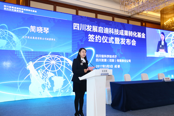 2017年3月3日,由川開集團與啟迪控股股份有限公司(以下簡稱“啟迪控股”)、四川發(fā)展(控股)有限責(zé)任公司(以下簡稱“川發(fā)展”)共同發(fā)起設(shè)立的“四川發(fā)展啟迪科技成果轉(zhuǎn)化基金”簽約儀式暨發(fā)布會在成都世紀(jì)城天堂洲際酒店隆重舉行,四川省科學(xué)技術(shù)廳副廳長楊品華主持本次簽約儀式。