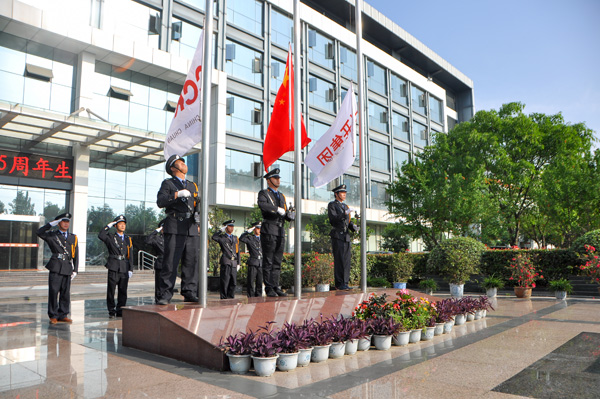2015年5月8日上午8時(shí)30分,集團(tuán)管委會領(lǐng)導(dǎo)及各公司總經(jīng)理與身著35周年慶典統(tǒng)一定制的T恤的全體員工,整齊列隊(duì)集團(tuán)辦公大樓前的廣場,舉行莊嚴(yán)的升旗儀式。全體人員神采奕奕,整個場面莊重嚴(yán)肅。